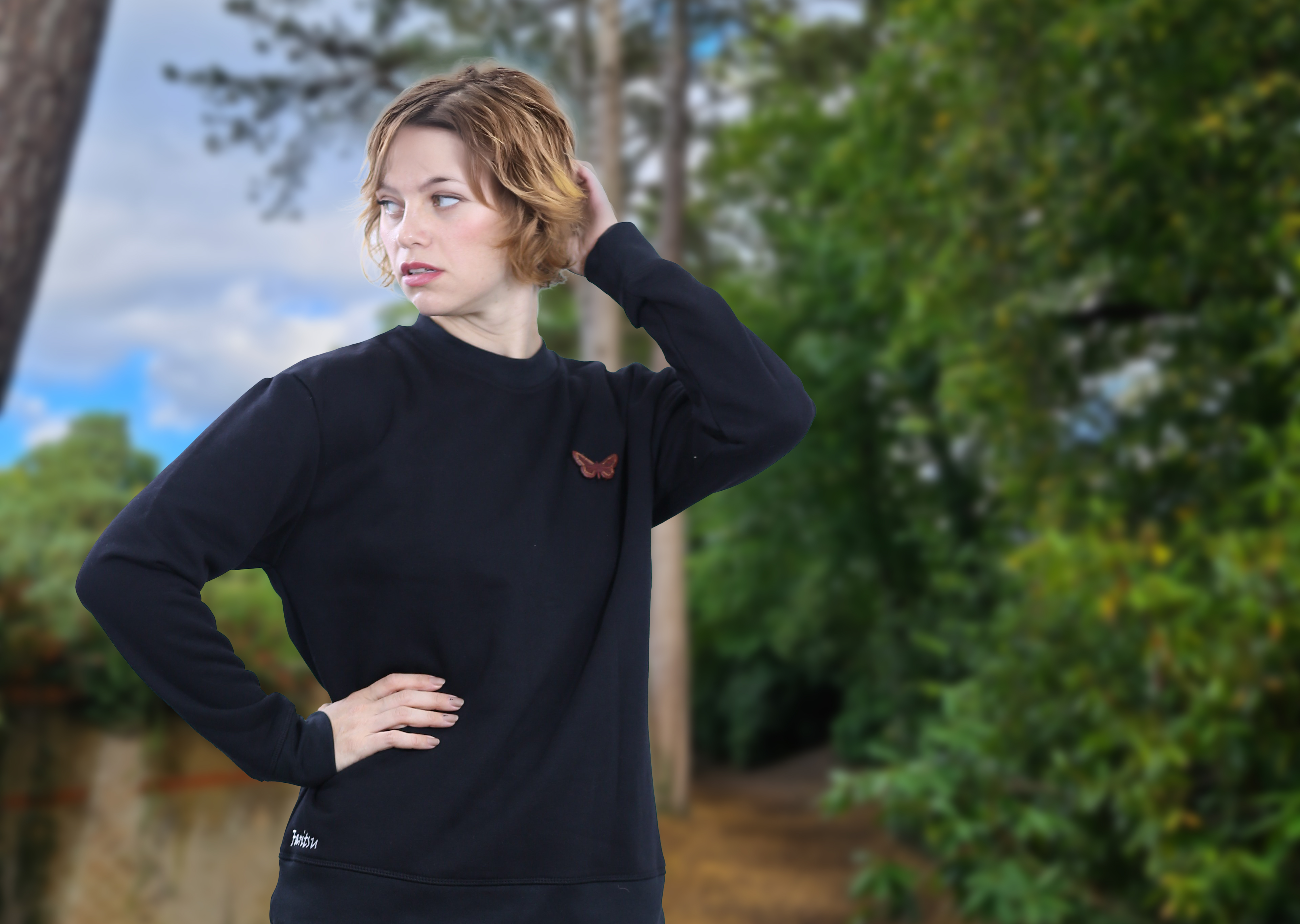 A hand made silver wire spun ‘Tree of Life’ pendant applique finished with blue gemstones embellishes a pure cotton luxury sweatshirt. A mosaic of metal, stone, ink and fabric transform this garment into an invaluable collectable for the bold.