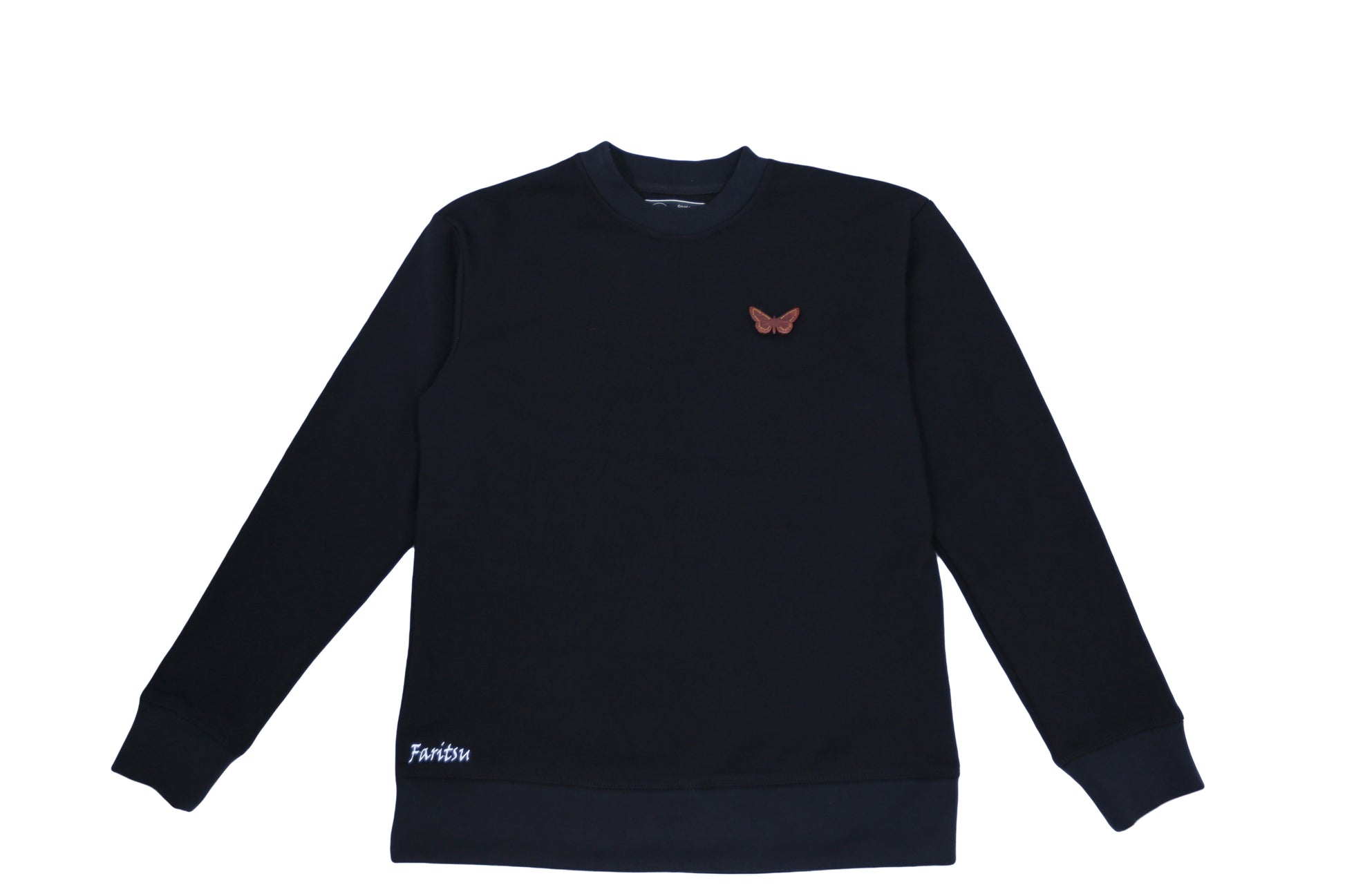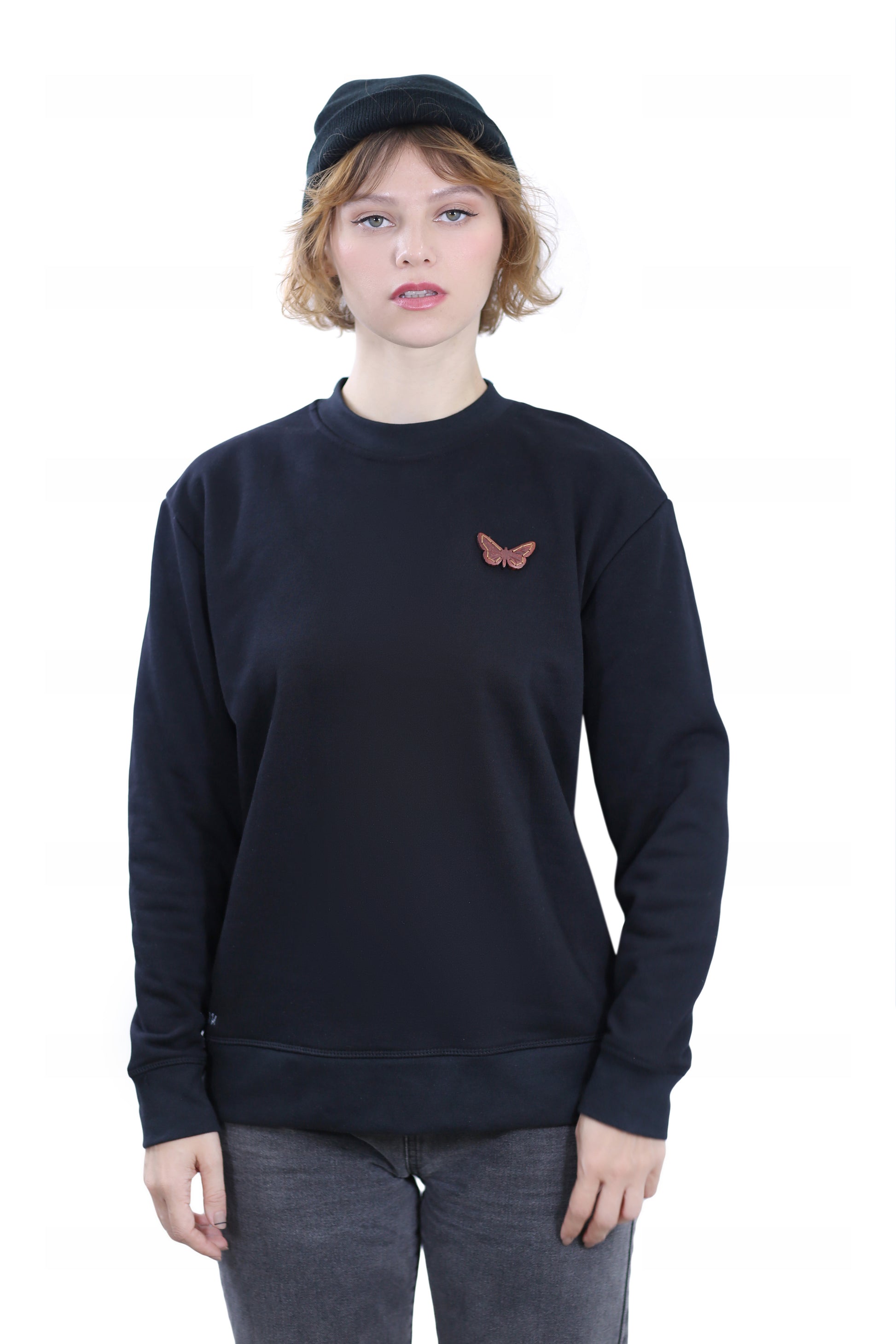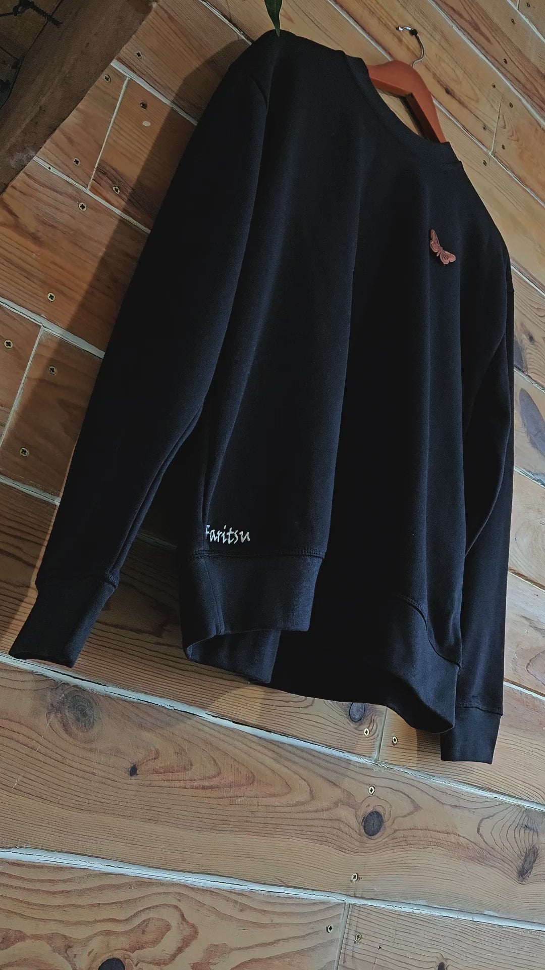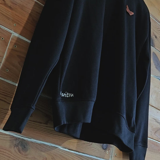An elegant black sweatshirt showcasing a beautifully hand-crafted butterfly made from American walnut wood. This rare leisurewear piece perfectly unites natural craftsmanship with soft cotton fabric, reflecting the graceful charm of the fluttering species in wearable art.