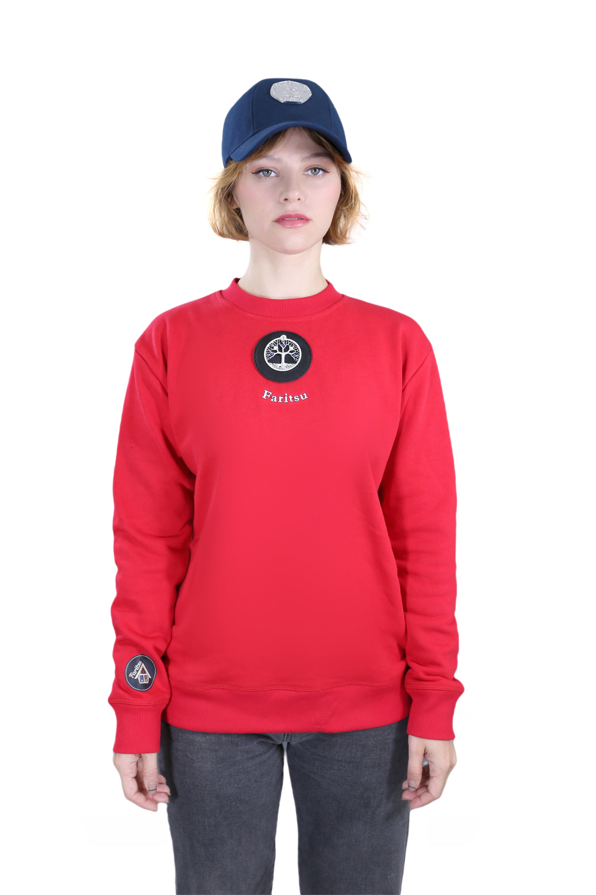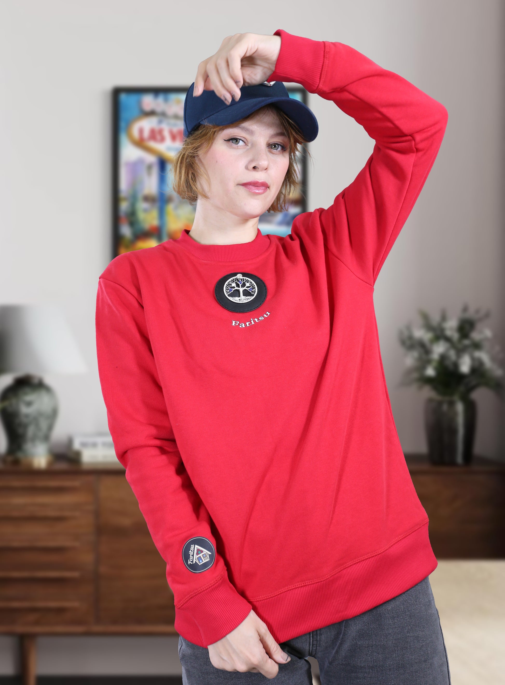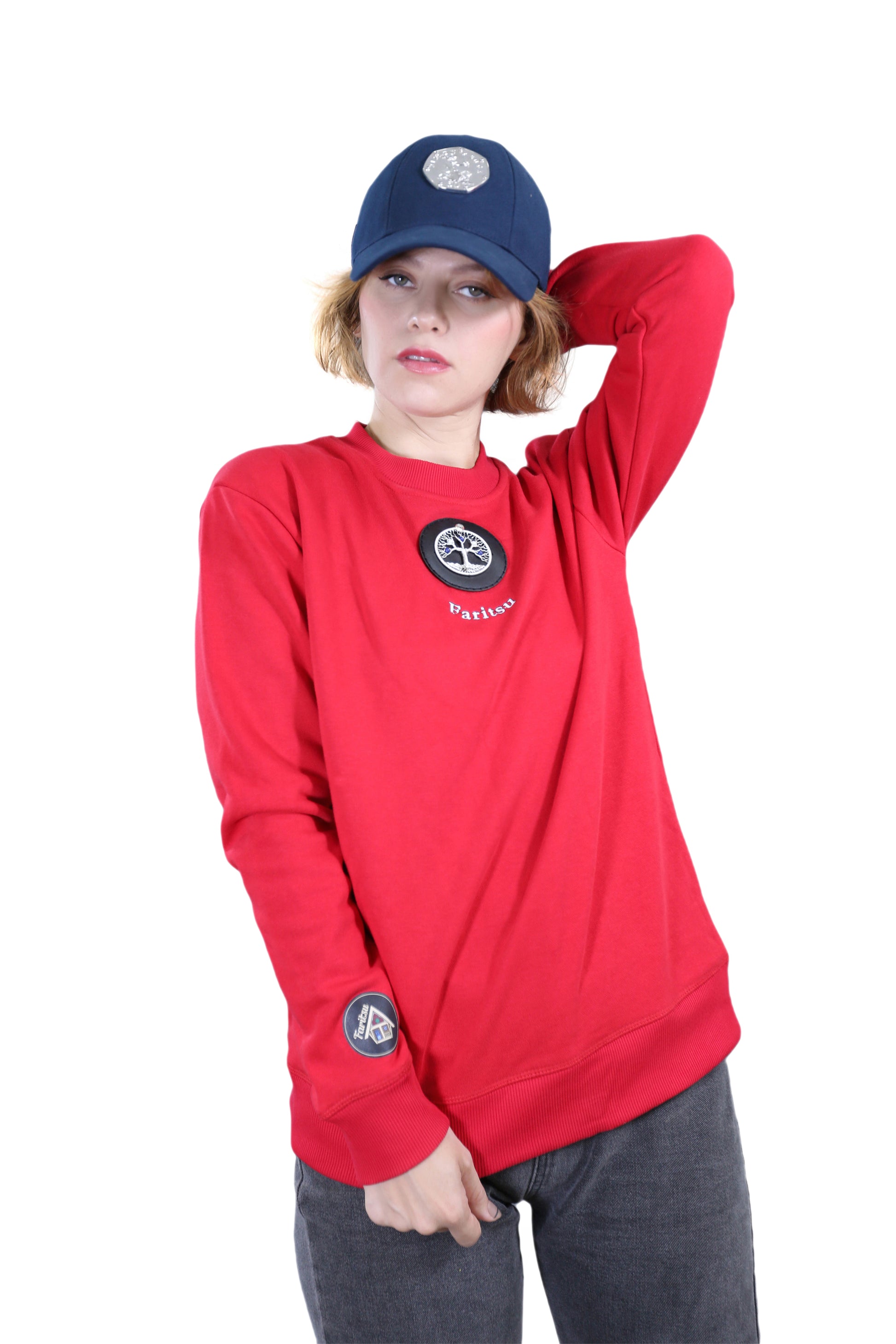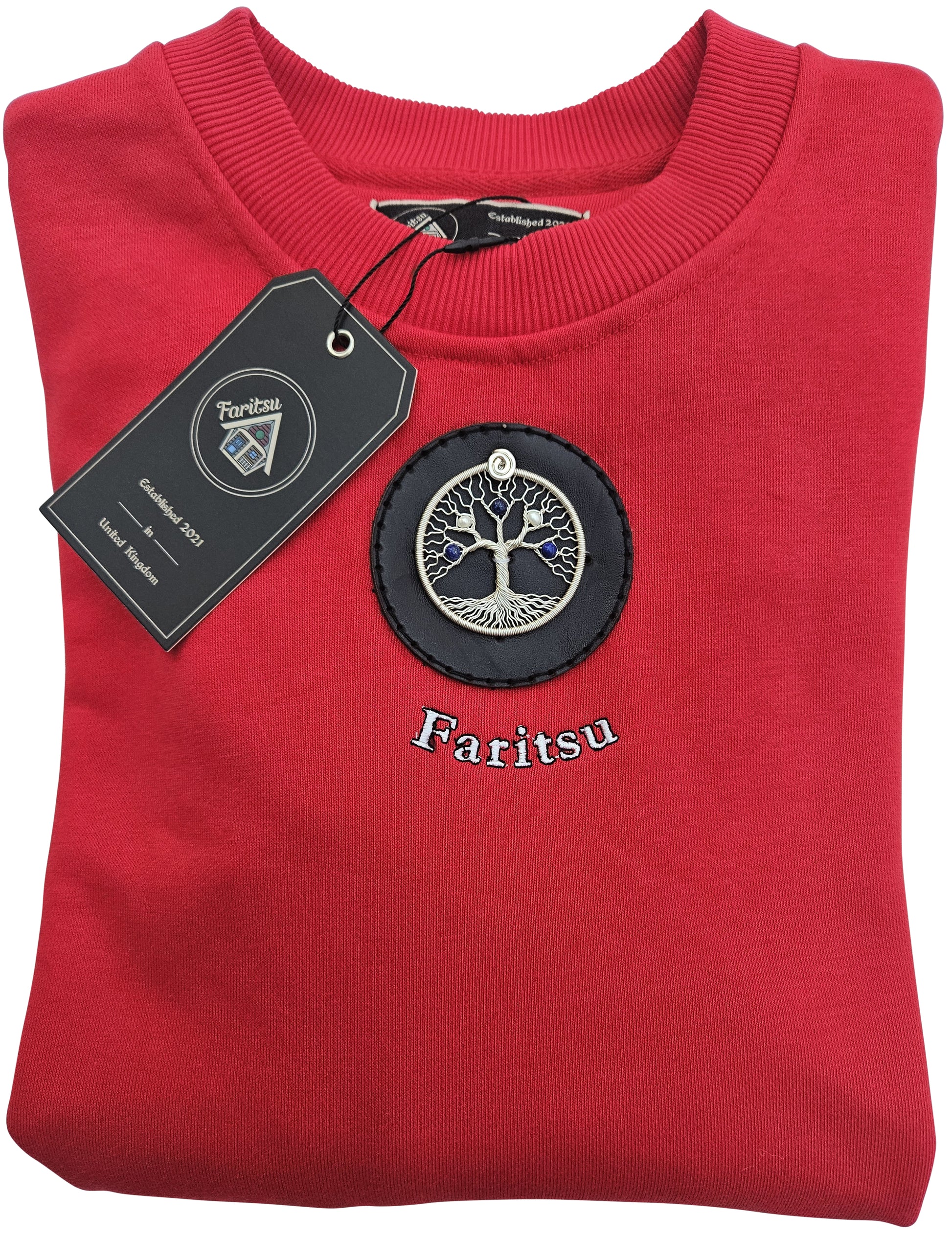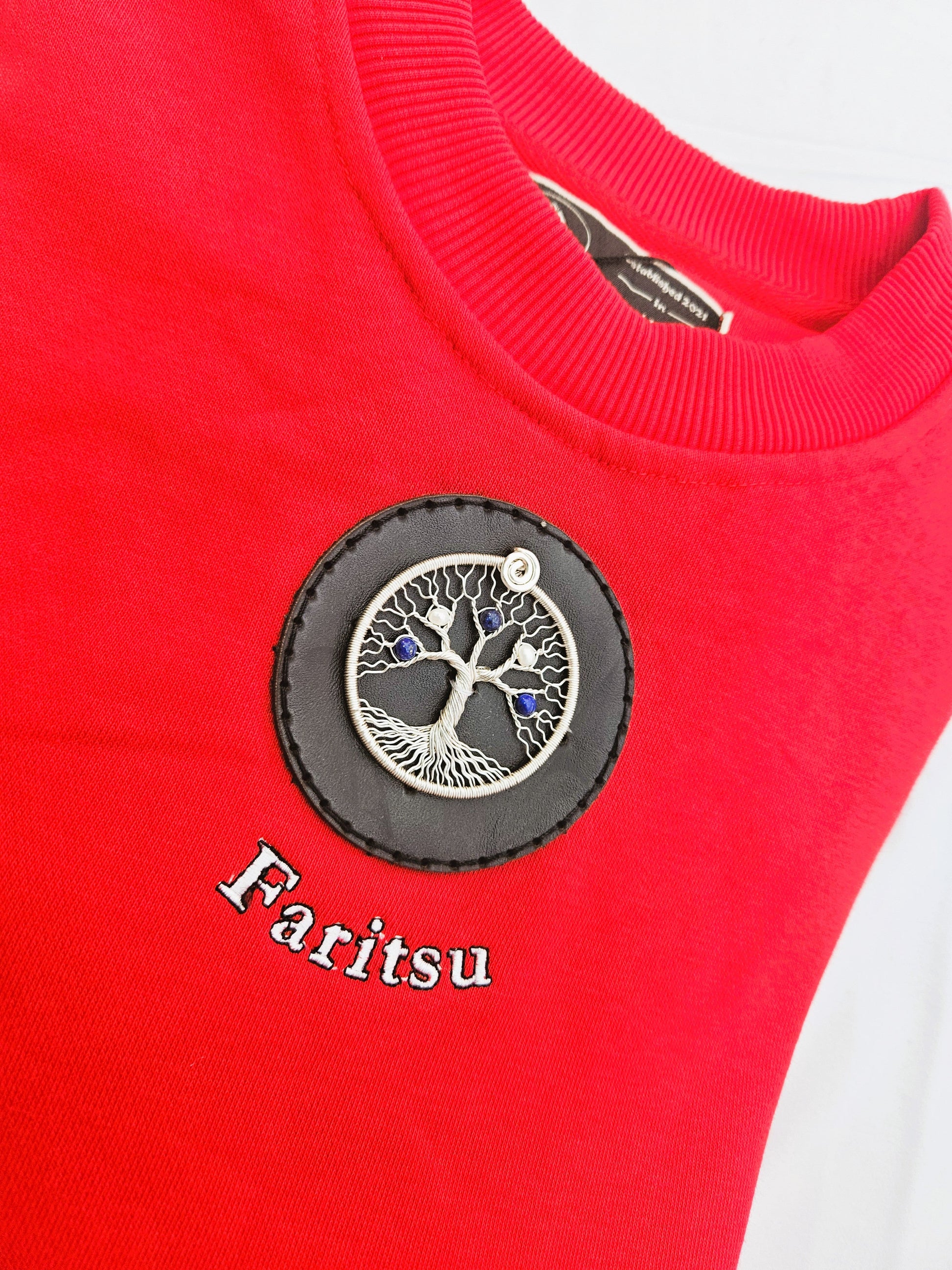 Make a bold statement with The Tree of Life, a red sweatshirt that blends art and craftsmanship into one stunning piece. Handcrafted with a silver wire–spun Tree of Life pendant and blue and white gemstone applique, this sweatshirt symbolises strength and creativity. A unique fusion of metal, stone, ink, and fabric — it’s more than fashion; it’s wearable art.